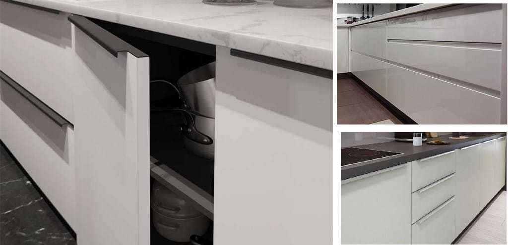 Гарнитур должен быть функциональным, желательно со встроенной техникой. На фасадах отсутствует декор, и даже от ручек можно отказаться, установив режим открывания от нажатия. Но со светлой поверхностью такое решение не самое практичное. Как вариант, можно выбрать фасады с интегрированными (скрытыми) ручками или профиль-ручки.