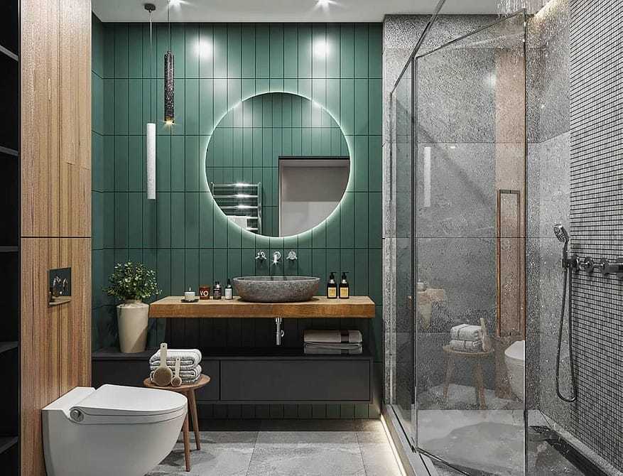Природный цвет подойдет для ванной в разных стилях и будет сочетаться со всеми популярными текстурами и черной сантехникой.