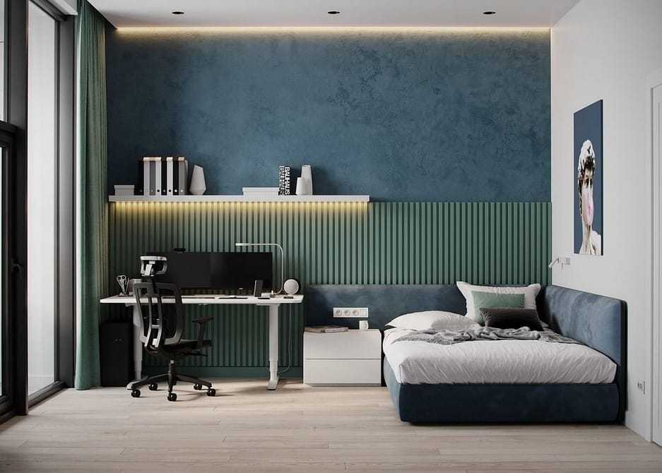 Это могут быть отдельные предметы или фронтальная стена, на которой находится телеэкран, мятные, салатовые или болотные оттенки — вашему покою это никак не помешает.