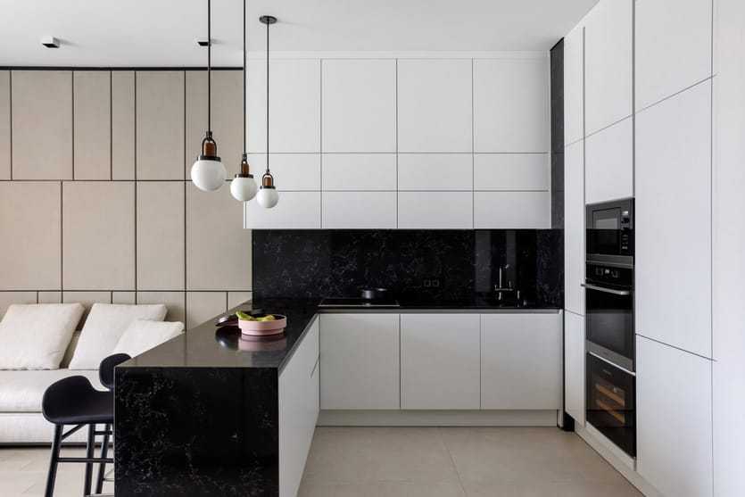 Кухня с белым гарнитуром в этом стиле обычно имеет гладкие фасады. Распространены чёрно-белые сочетания: это может быть чёрная плитка на полу и фартуке либо тёмная столешница.