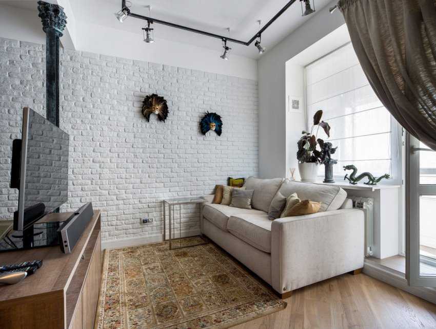 На фото – дизайн гостиной с оформленной белой кирпичной стеной.