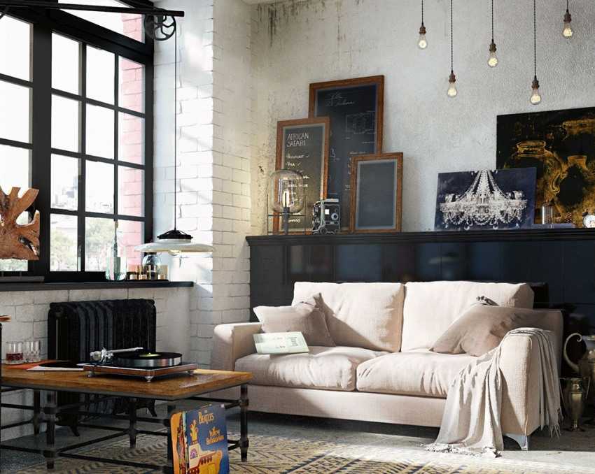 Повесь поверх кладки современный плоский телевизор. Используй массивную открытую подвесную конструкцию. Это самый легкий способ вписать современную технику в простой лофт.