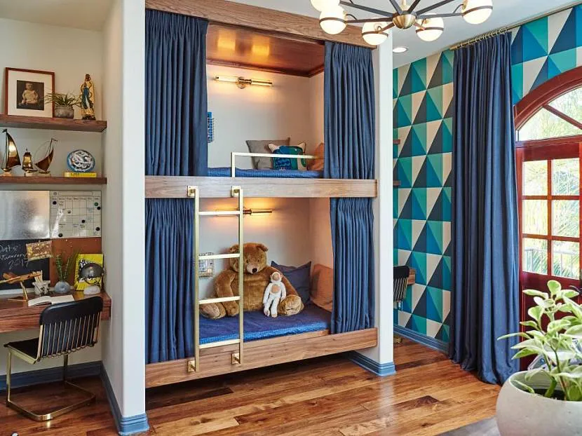 Малыша размещаем внизу, чтобы он случайно не упал с высоты. Внизу можно сделать шторку для младшего и дать ему возможность побыть “в своей крепости” в одиночку, пока старший занимается домашним заданием или сидит за компьютером.