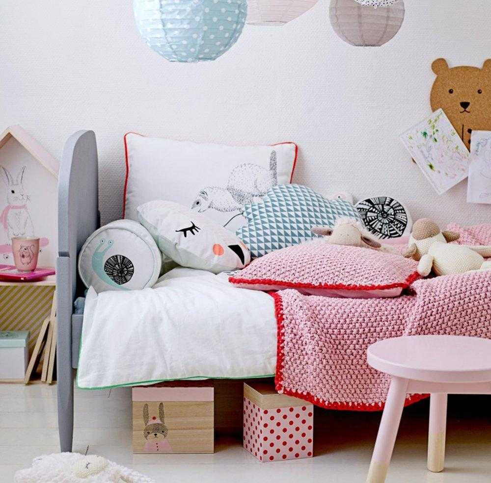В дополнение спальное ложе украшают балдахином или другими элементами декора – цветными подушками, пледом (рекомендуем прочитать: балдахин на детскую кроватку – пошаговый МК с фото). Над изголовьем следует повесить светильник-бра, чтобы девочка могла читать и заниматься своими делами. Для малышей обязательно нужен ночник.