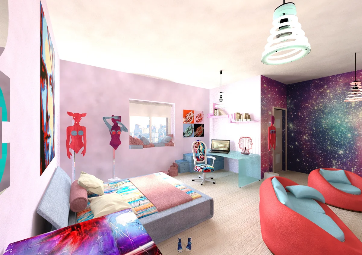 Здесь можно отойти от привычных рамок и позволить в дизайне более яркие оттенки, но перебарщивать не стоит. Также желательно добавить в интерьер электрические элементы, постеры с любимыми персонажами – все будет уместно в этом стиле.