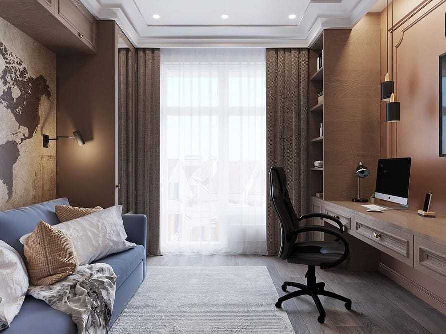 В позднем подростковом периоде комната мальчика обретает брутальность. Ребенок постепенно превращается в сформировавшуюся личность, его окружение становится комфортнее, зонирование – грамотнее. Все меньше места отводится под активное времяпрепровождение, его занимают гардероб, стеллажи, рабочее пространство.