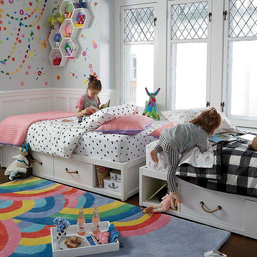 Чтобы у вас осталось достаточно пространства для реализации других идей дизайна интерьера, лучше всего выбрать кровати на подиумах. Часто они оснащаются выдвижными ящиками, которые отлично подойдут для хранения вещей и игрушек. Иногда кроватки для двоих детей устанавливают вдоль одной стены, однако в этом случае вам потребуется разделитель: