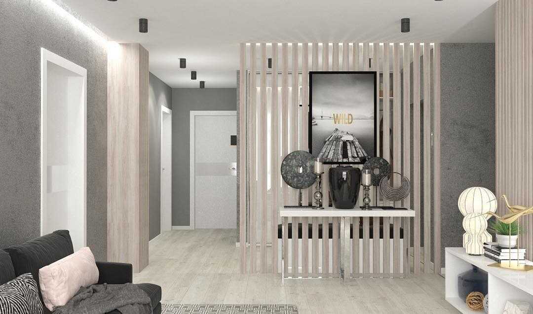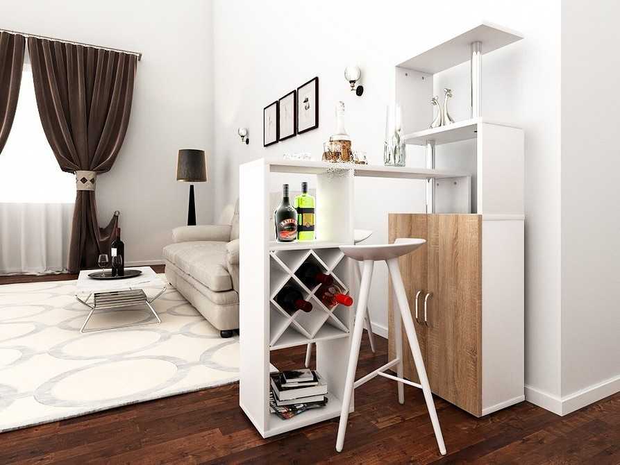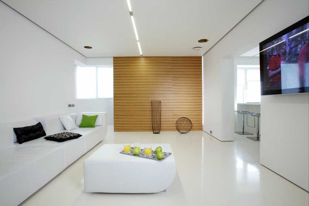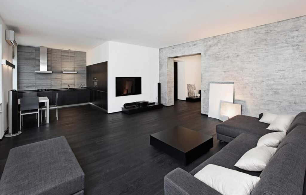 Количество мебели должно быть минимальным — ни одного ненужного предмета. Упор делается на простую форму с четкими линиями. Перегородки используют для разграничения пространства. Они могут быть сделаны из дерева, металла, стекла и даже бусин. В больших квартирах для зонирования можно устанавливать лаконичные полукруглые или прямоугольные арки из гипсокартона. В особенности этот вариант подойдет тем, кто совмещает основной дизайн с ар-деко или нео-классикой. Барная стойка, отделяющая кухню от гостиной — еще один современный элемент.