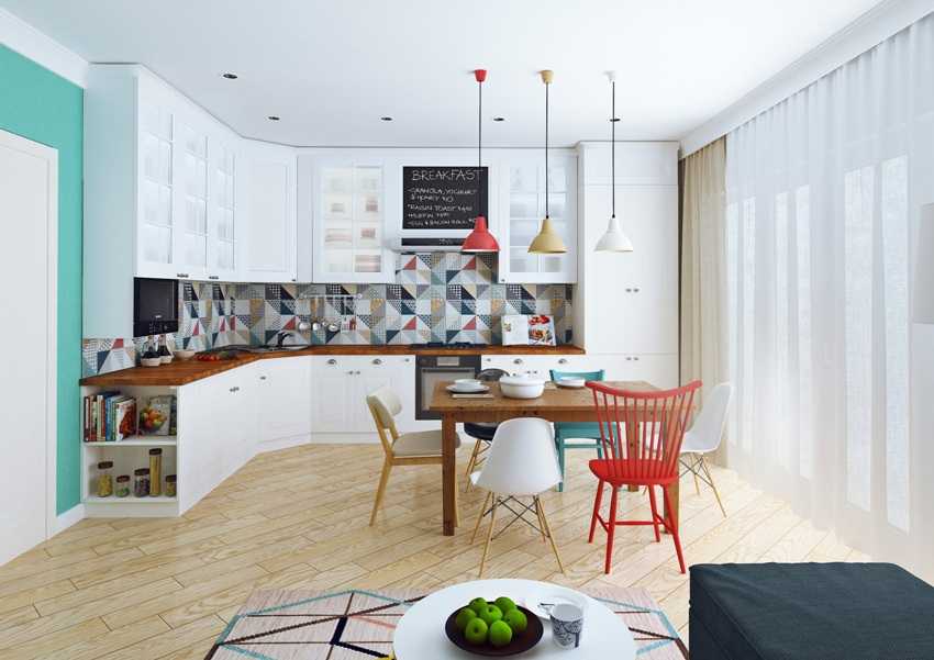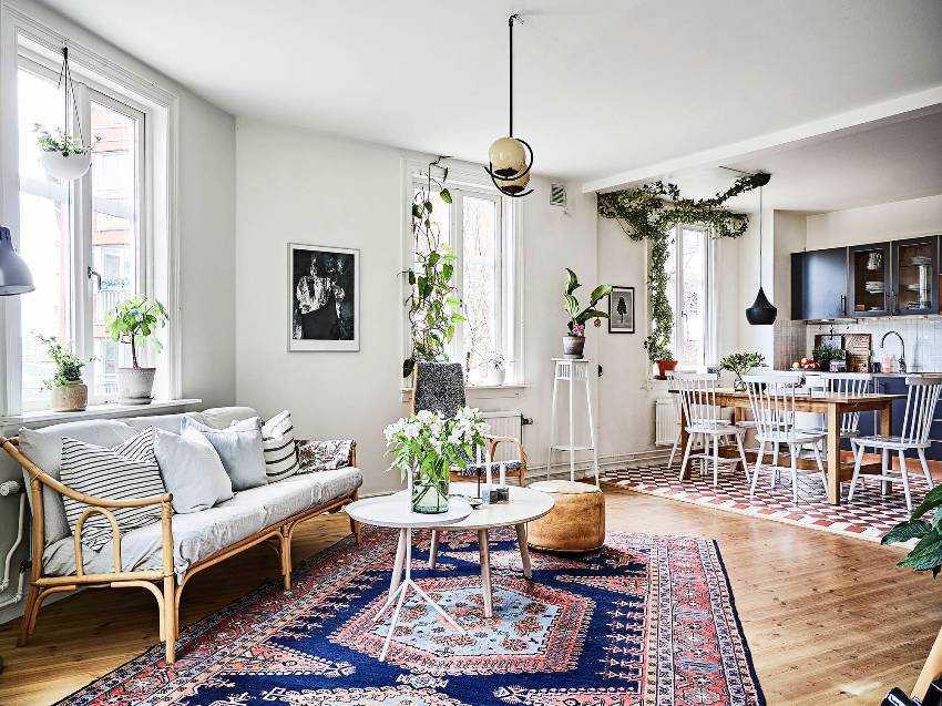Ещё один интересный вариант – оформление помещения в скандинавском стиле. Он предполагает использование дополнительных дизайнерских мелочей, которые представляют собой сочетание металла и ярких цветовых решений. Обивку мебели можно оформить узорами в клетку и дополнить интерьер некоторыми клетчатыми элементами.