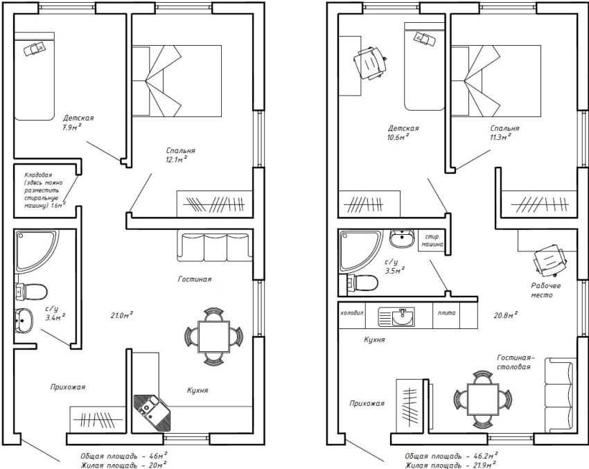 Наличие в доме двух комнат позволяет максимально комфортно организовать значимые функциональные зоны. Как правило, одна комната отводится под гостиную, а другая под спальню и/или детскую. Кстати, гостиную вполне можно совместить с рабочим кабинетом, поскольку он не занимает много пространства. В качестве перегородки рекомендуем использовать стеллаж. Гостиную не стоит загромождать мебелью. Достаточно одного дивана, миниатюрного кресла и журнального стола на колесиках. Большую часть пространства второй комнаты (детской или спальни) занимает кровать и прочая мебель (шкаф, трюмо, комод и т.д.). Чаще всего спальные комнаты обустраивают в стиле классицизм, винтаж или барокко. Для детской лучше выбирать более динамичные стили, такие как модерн, хай-тек, фьюжен. Больше вариантов дизайна интерьера “двушек” можно найти на фото в интернете.