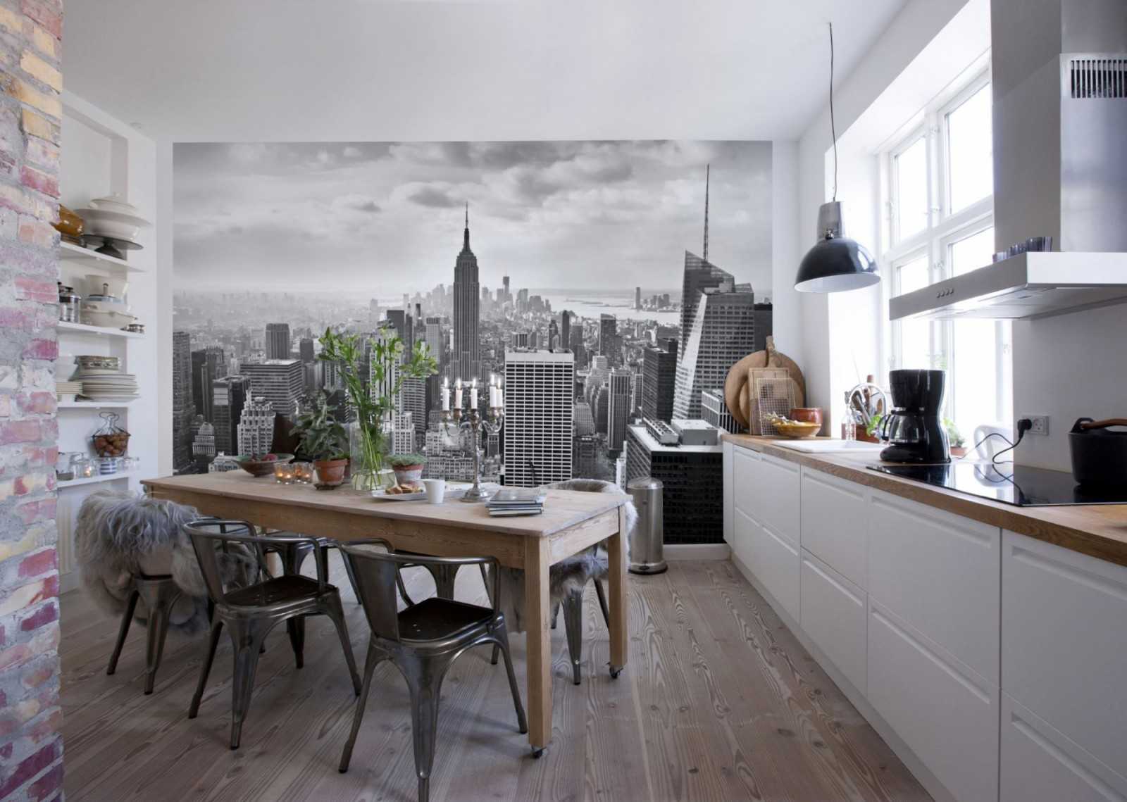 Популярно изображение на одной из стен современных мегаполисов или достопримечательностей культурных центров. Они занимают одну стену или выполняются в трёхмерном пространстве. Помимо этого, стену украшают большими и объёмными фотографиями или портретами. Важным требованием является то, что они должны быть чёрно-белыми. Причём лучше, если они не будут иметь рамок – все границы должны быть стёрты.