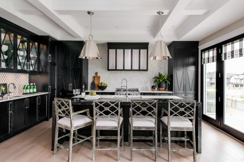 В классических кухнях часто используют сочетание черного и белого. В таком случае черную столешницу изготавливают из гранита или любого литого кварцевого материала. Но при этом нужно помнить, что при работе с мрамором есть проблемы с техническим обслуживанием.