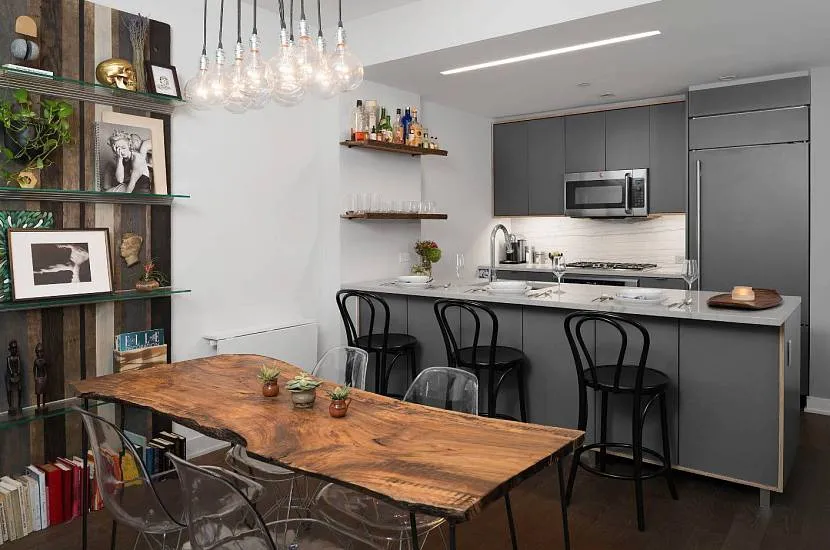 Если ваша кухня 12 кв.м. совмещена с гостиной, то барная стойка, остров и полуостров — хорошие альтернативные варианты обеденных зон, которые заодно решают вопрос с зонированием.