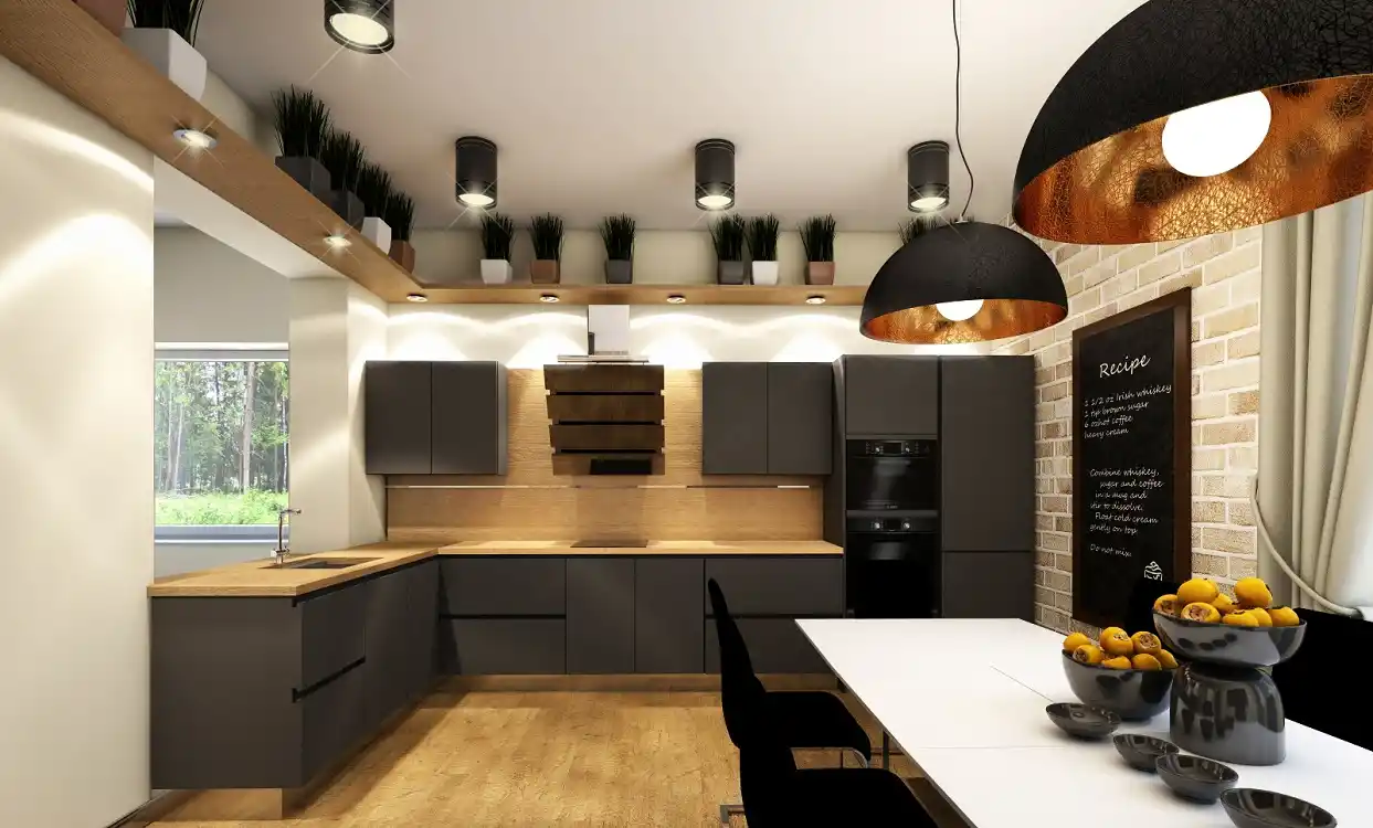 Кухня 14 м2 требует большего внимания к освещению, чем меньшие по площади комнаты. Для достаточного освещения подойдет люстра средних и небольших размеров. Точечные светильники желательно оборудовать в рабочей зоне.