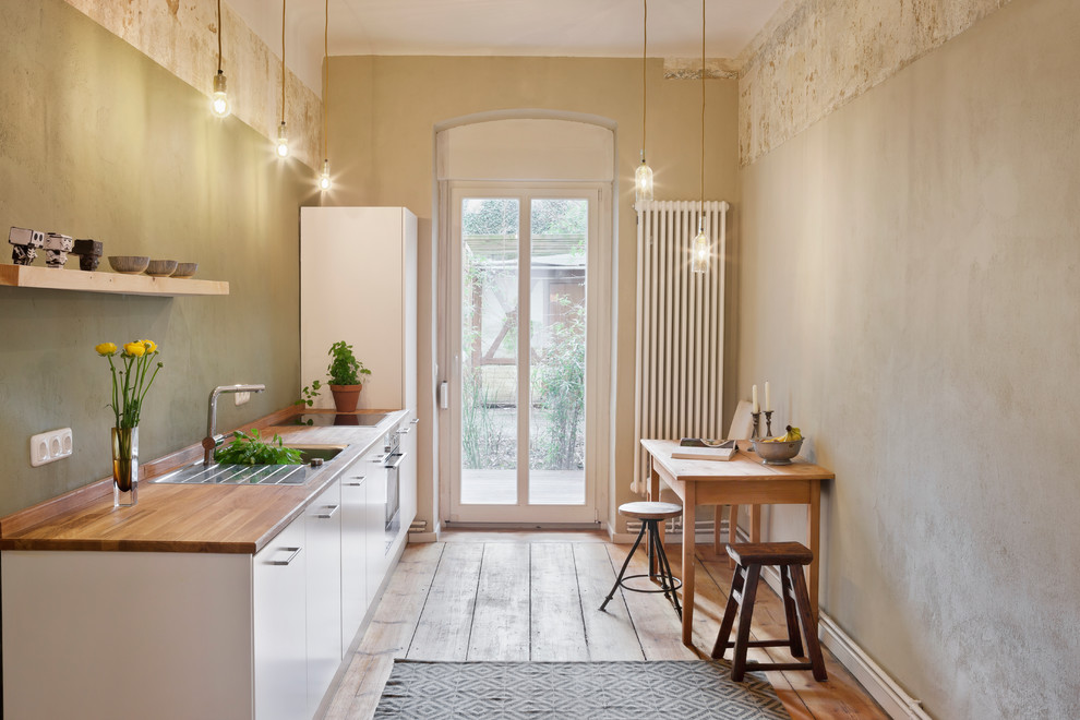 Уберите двери. Дверь сужает кухню. Снимите дверь, а вместо этого, сделайте высокую и широкую арку. Линии должны быть плавные. Можно даже придумать не просто круглую, а замысловатой формы.
