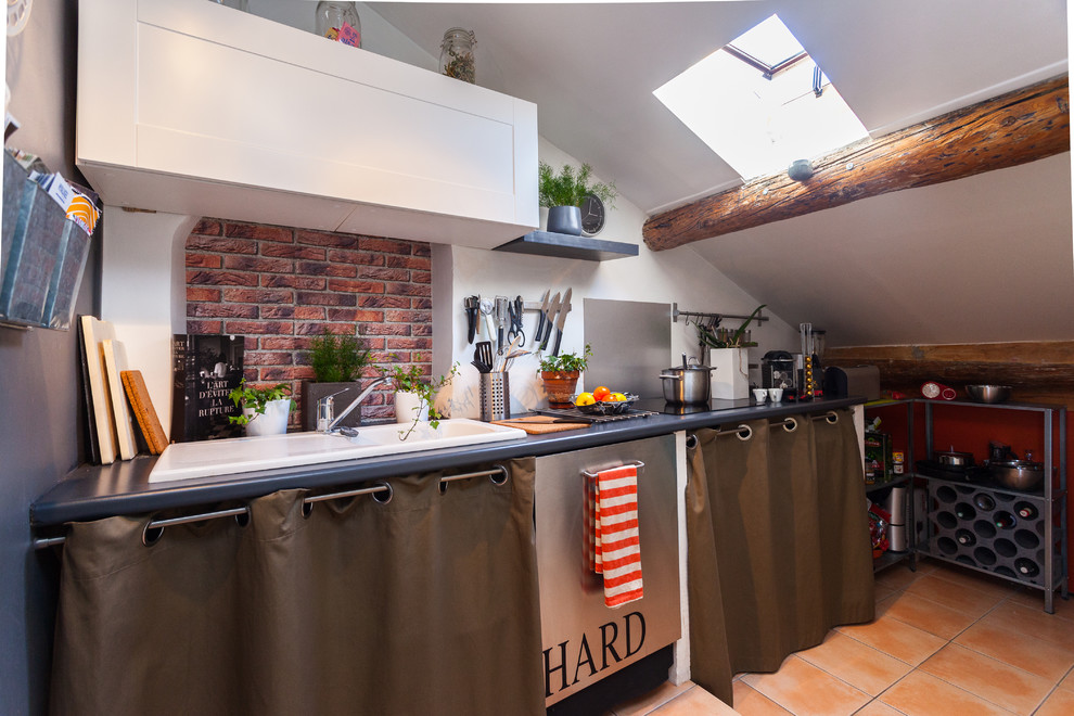 Это решение позволит справиться с дефицитом места для хранения инвентаря. Зазор от холодильника до газовой или электрической плиты должен быть минимум 0,15 м. Это требование прописано в нормах технической безопасности. Маскировка труб и прочих коммуникаций производится фасадами. Бытовую технику советуют выбирать поуже (та же посудомойка — до 0,45 м).