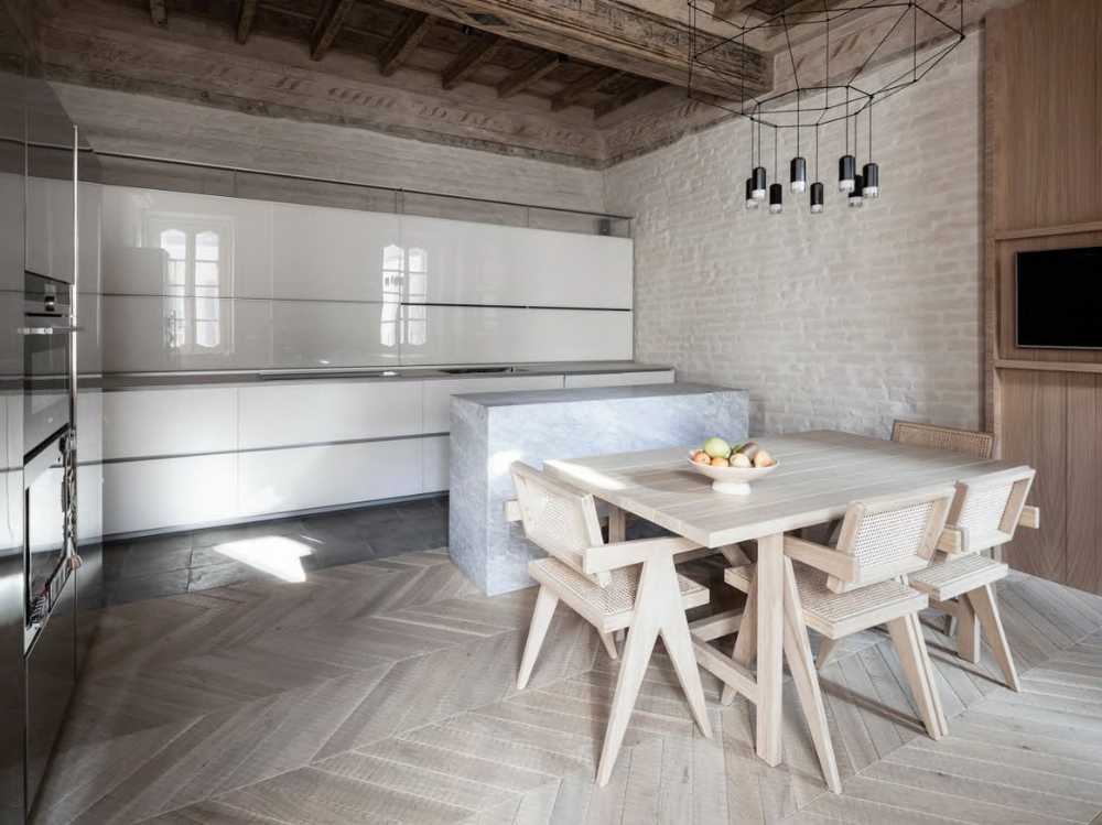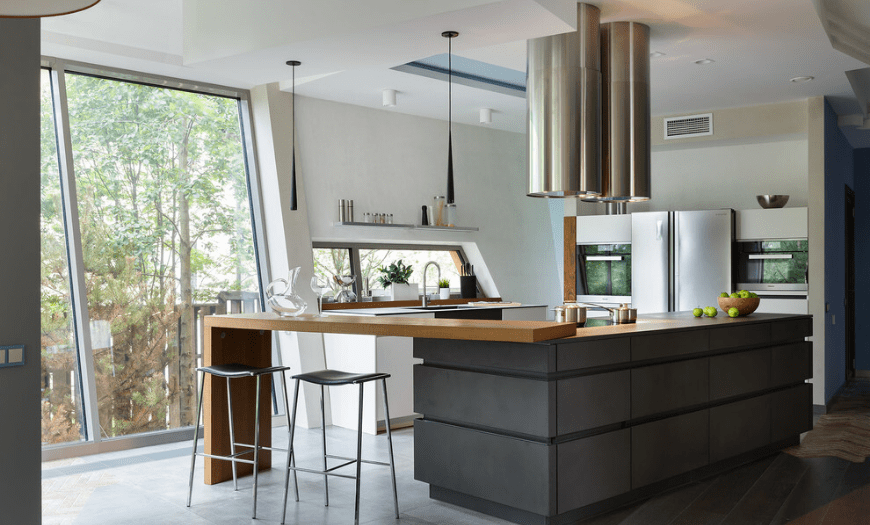 Форма комнаты имеет значение в лофте: длинная комната будет испорчена, если поставить кухонный гарнитур вдоль стен. Если площадь позволяет, лучше включить в интерьер остров, он поделит помещение на функциональные зоны и окажется очень полезным.