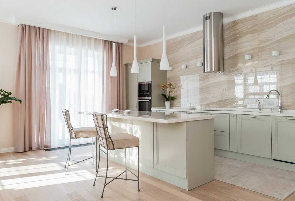 Из материалов можно порекомендовать мрамор: он идеален для кухни-студии, прекрасно сочетается с изящной мебелью и остальным декором классики.