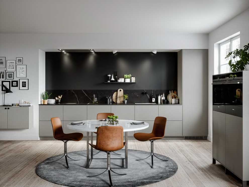 - в большом пространстве обеденный стол нужно разместить между барной стойкой и диваном;