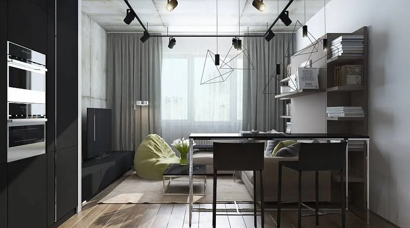 - Такое проектирование можно нередко увидеть в однокомнатных некрупногабаритных квартирах-студиях. Обычно в них нет лишних вещей, а только действительно необходимые предметы для жизни.