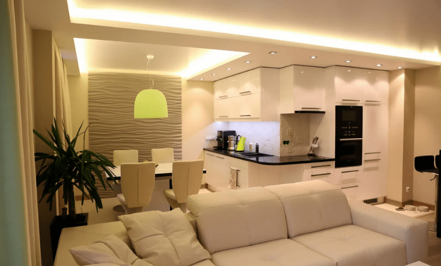 Простой покраски потолка для кухни-гостиной скорее всего будет недостаточно, даже если он у тебя идеально ровный. В него не удастся удобно встроить многоуровневое освещение, без которого не обойтись в объединенной комнате.