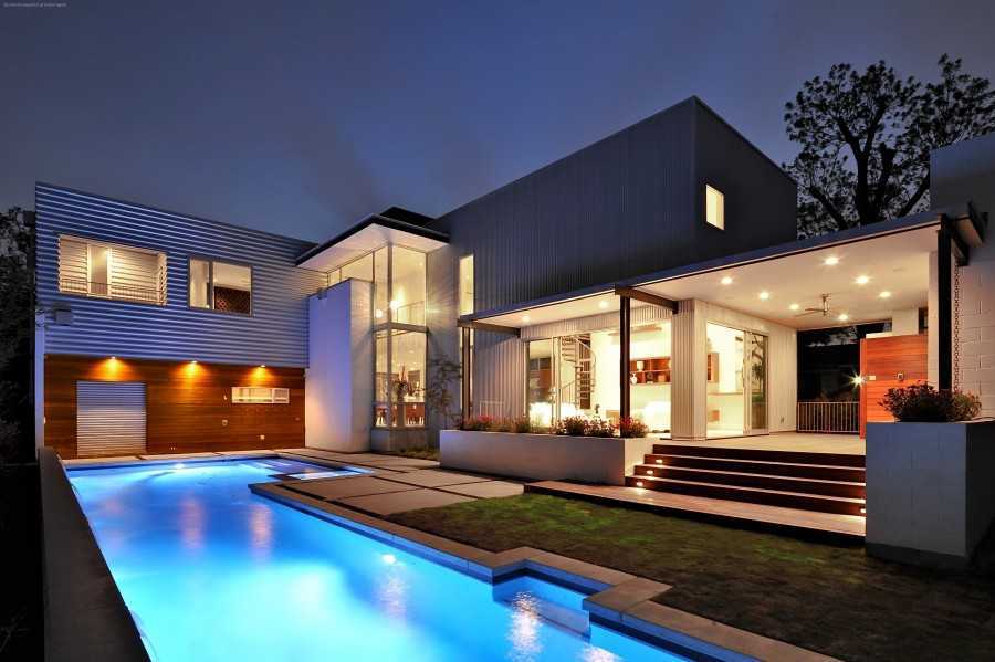 Первое, что характеризует такие дома – лаконичность. Такой эффект достигается благодаря использованию материалов с гладкой фактурой и блеском. К ним относятся бетонные конструкции, стекло и металл. Они хорошо между собой сочетаются, а особенно в отделке дома.