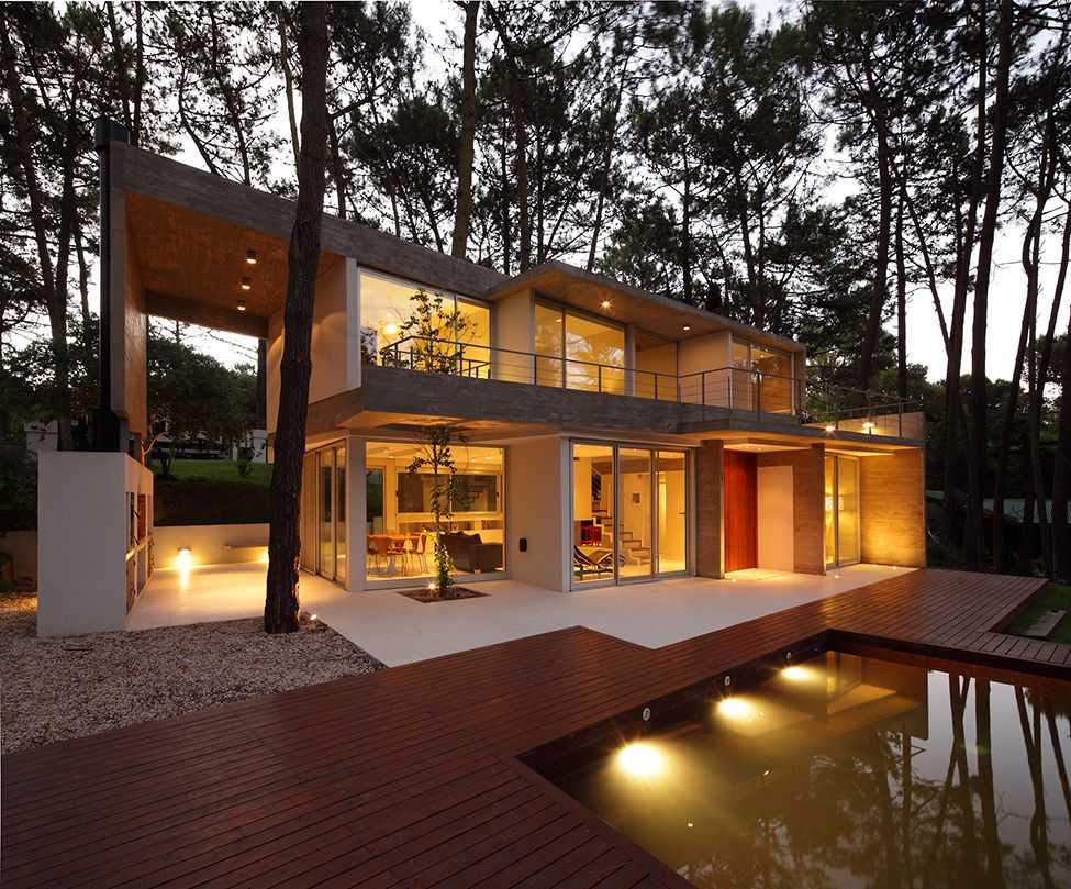 В свою очередь, дерево практически не используется, за исключением редких случаев. К примеру, отделка деревом позволяет смягчить строгость линий фасада. А также помогает дому органично выглядеть на фоне природы.