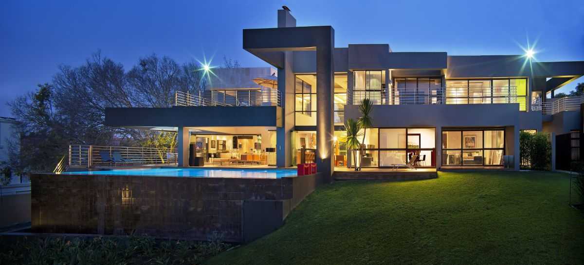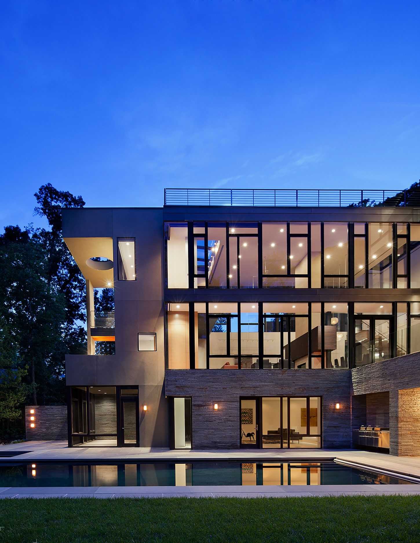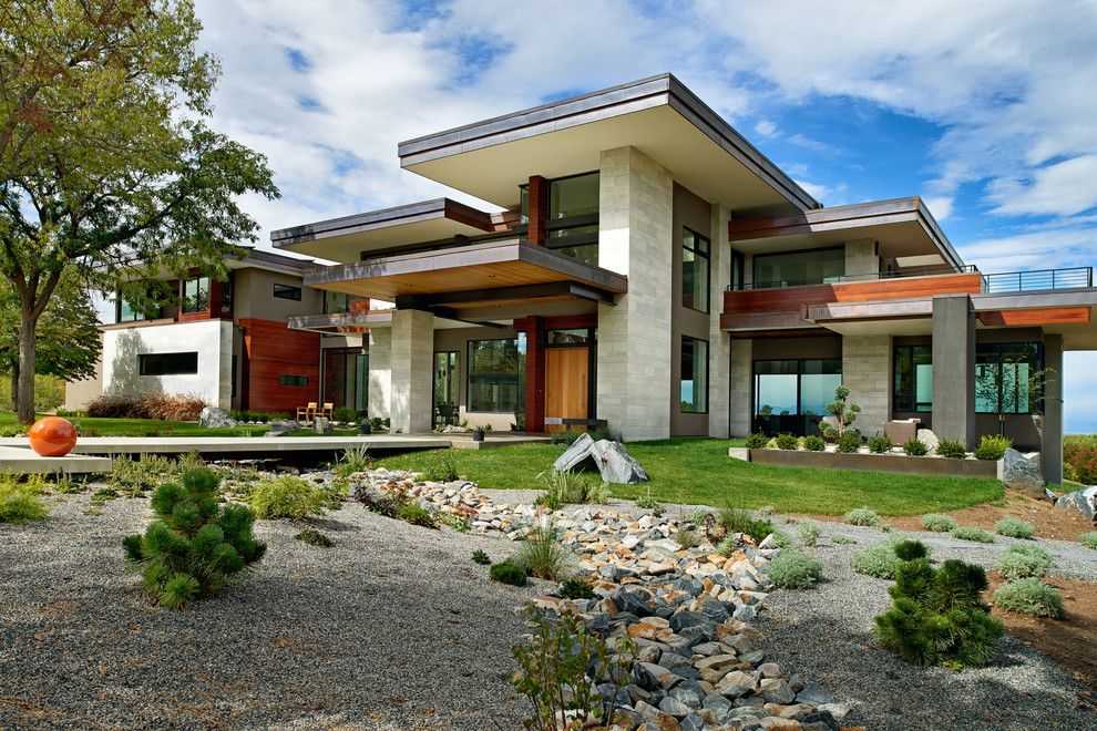 Что касается экстерьера, то дома в данном стиле всегда очень большие. За счет этого обеспечивается внутренний простор с минимальным количеством перегородок и стен. Это же касается и окон, которые должны быть большого размера. Довольно часто такие дома имеют застекленный фасад, что выглядит потрясающе красиво.