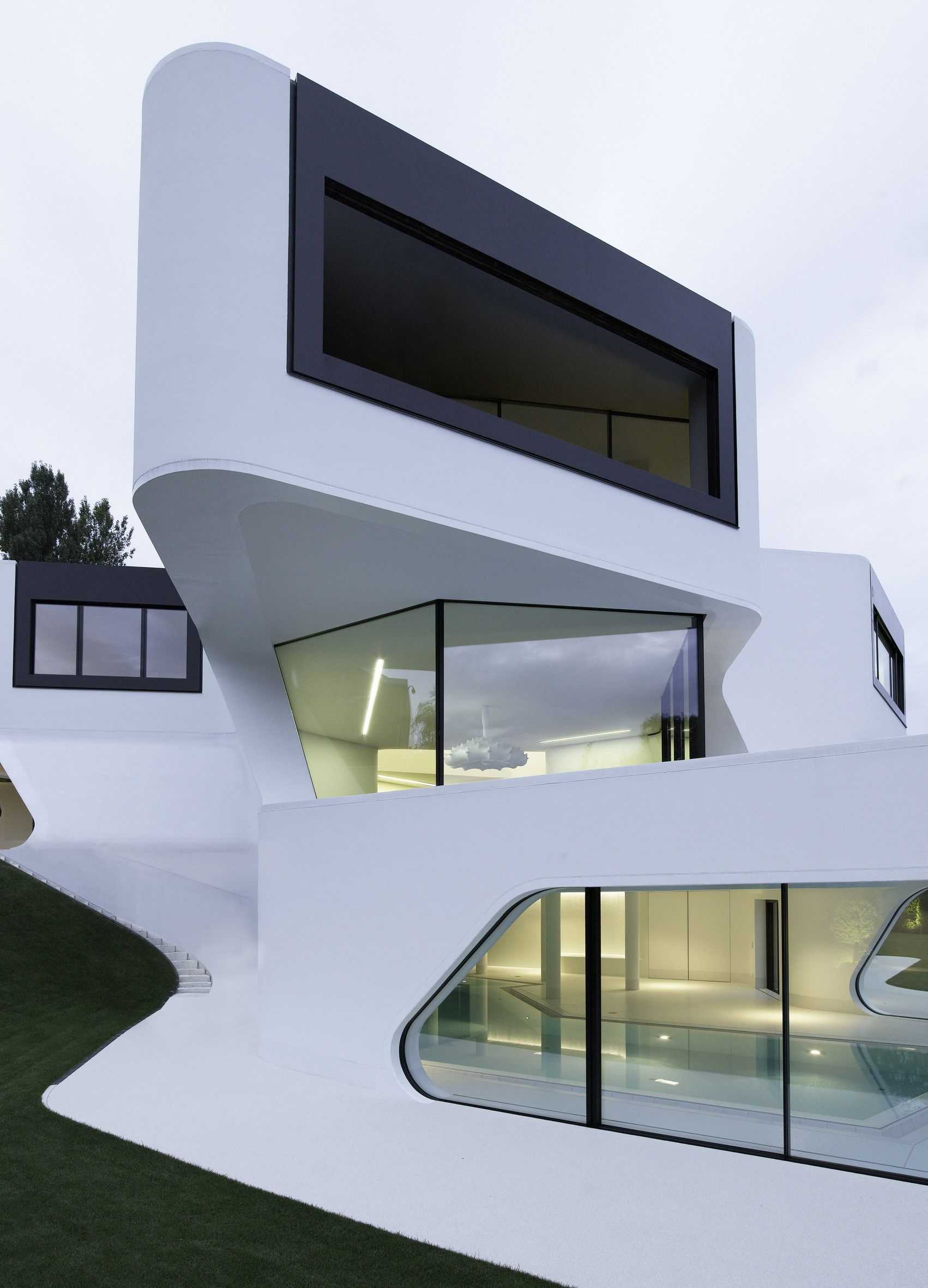 - Окна в доме высоких технологий панорамные. Строго геометрических форм. Оформление оконных проемов крайне лаконичное — никаких декоративных решеток, частых переплетов и броской фурнитуры.