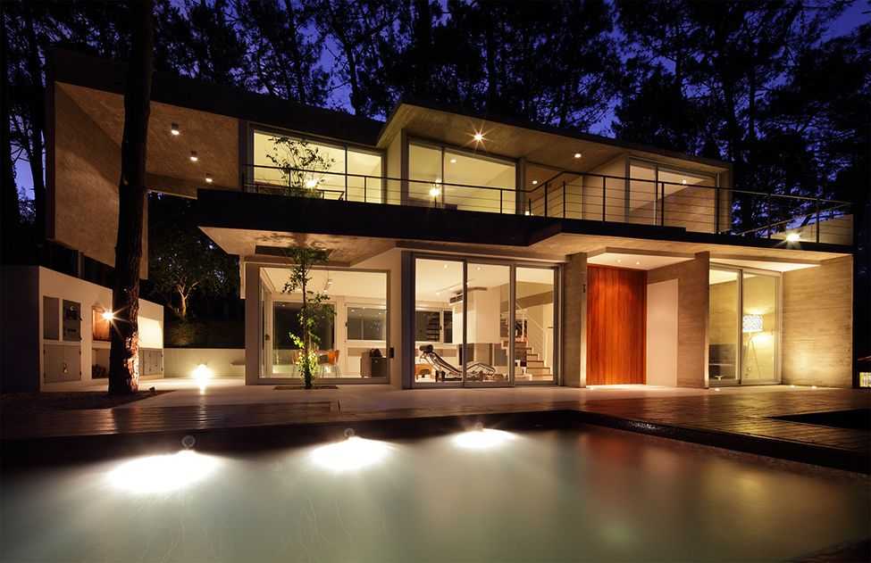Несмотря на то, что в данном направлении все используется рационально и с учетом экономии ресурсов, фасад дома все же может подсвечиваться. Сочетание с зеркальными поверхностями позволяет создать потрясающе красивое мерцание, которое подчеркивает красоту дома.