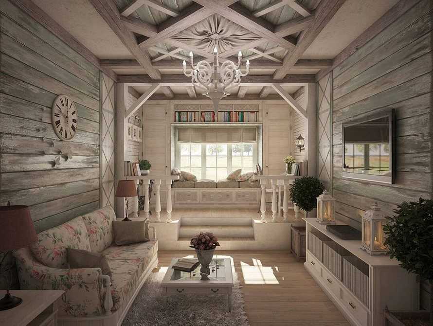 Гостиная в стиле прованс максимально наполнена естественным светом. Большие открытые окна пропускают солнечные лучи и озаряют комнату уютом. Стены отделывают штукатуркой или небрежной кирпичной кладкой, выкрашенной в белый цвет, полы покрывает паркет, камень или беленое дерево. Потолок могут украшать деревянные балки или лепнины.