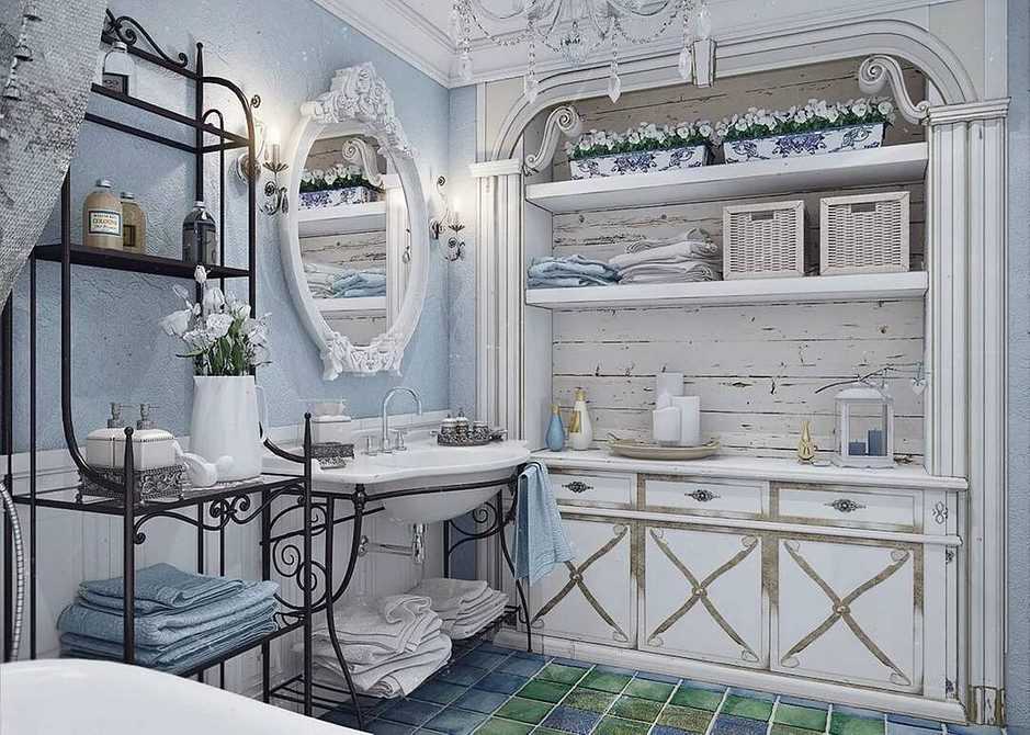 Отделка ванной и туалета в стиле прованс традиционно выполняется в светлых тонах. Кафельная плитка может быть однотонной или с легким цветочным узором. Так же гармонично смотрится плитка с эффектом старины и потертостей. Полезную функцию в интерьере ванной выполняют плетеные корзины и кованые этажерки.
