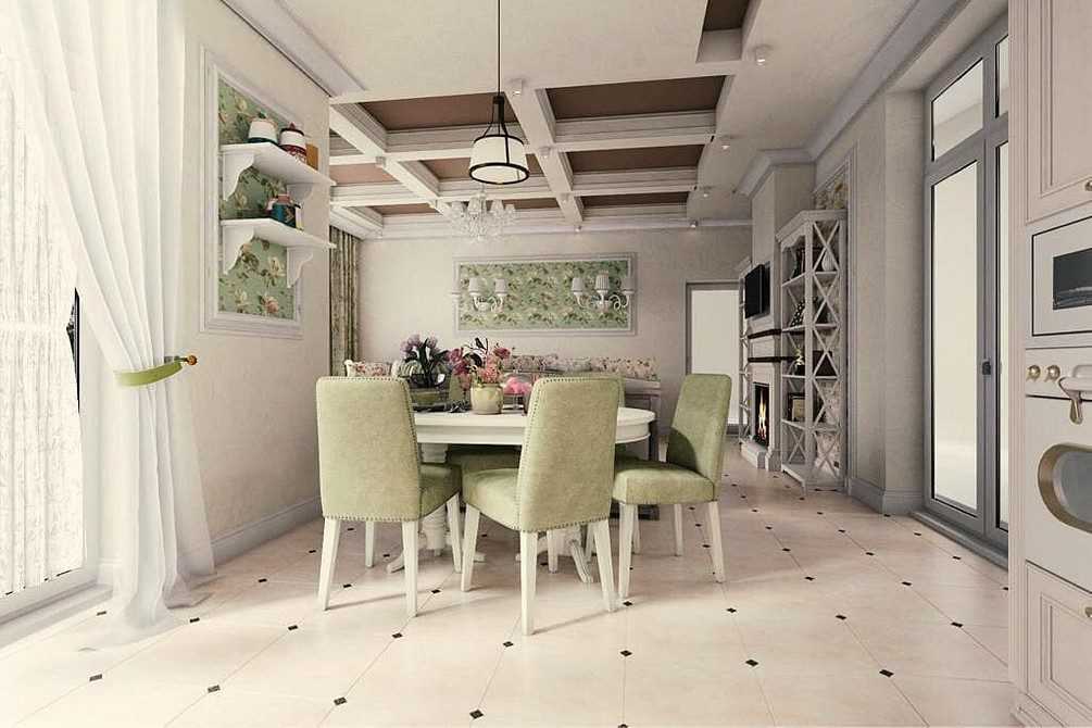 Идеальным вариантом будет объединенная кухня-столовая. Отделка стен выполняется штукатуркой светлого тона, нанесение грубое, с заметными неровностями и шероховатостями. Выбор напольного покрытия отдается в пользу дерева, паркета с имитацией дерева и плитки.
