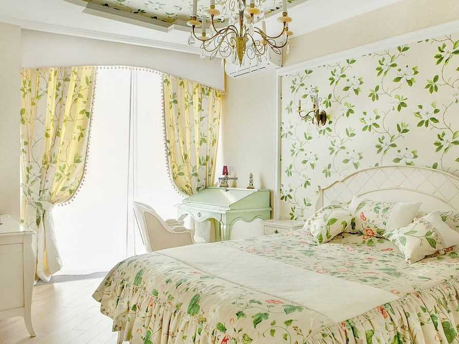 На обоях для стен прованс в изобилии используется цветочный принт. Это своеобразная визитка в провансальском направлении дизайна интерьеров. Помещение должно быть естественно освещено. Желаемый эффект достигается за счет использования на окнах легкого струящегося тюля. Очень уместно будет использование фарфоровой и текстильной декоративной фурнитуры. Дизайн мебели прост, но смотрится необычно и элегантно.