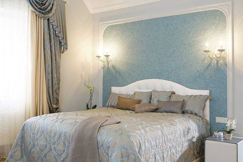 В узких спальнях акцентную отделку можно сделать у стены в изголовье, которая будет переходить в потолок. Это позволит сделать вытянутое помещение пропорциональным по размерам.