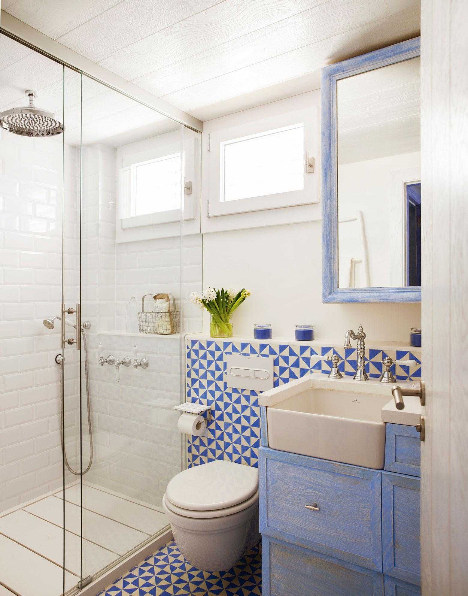 Интересный дизайн маленькой ванной комнаты 4 кв.м. в морском стиле понравится всем мечтателям и путешественникам. Спокойная бело-голубая палитра с зеленоватой примесью бирюзы и океанского бриза, ракушки, всевозможные корабельные детали и рисунки с обитателями водных глубин — каждый раз будут напоминать вам о беспечном отдыхе на побережье и далеких неизведанных островах.