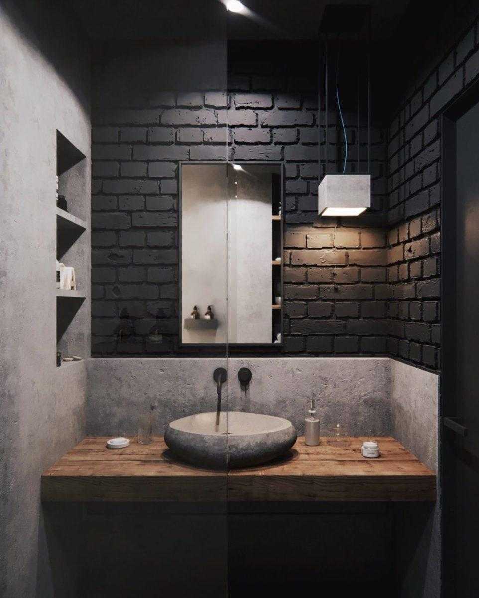 Ванная комната в индустриальном стиле содержит старинные предметы мебели, необычные осветительные приборы, «строительный» душ с оригинальной лейкой. Напольное покрытие имитирует бетон. Трубы, вентиляционный короб, нарочито грубая отделка стен (кирпичная кладка, штукатурка) дополняют общую картину.