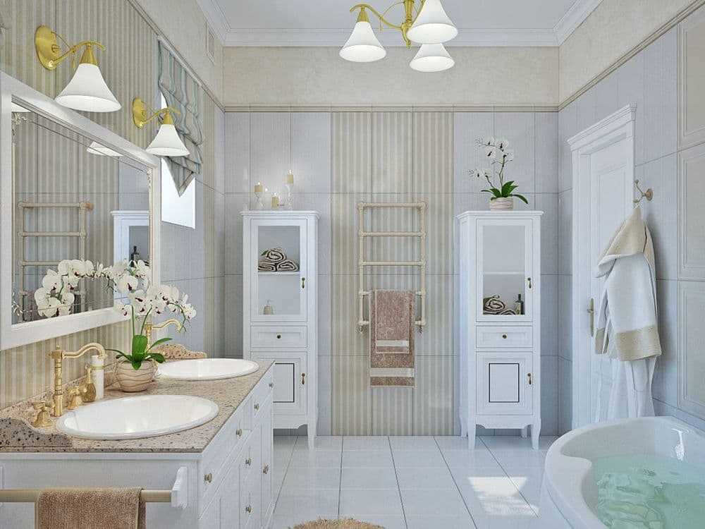 Уникальная и утонченная атмосфера ванной комнаты в этом удивительном стиле подарит такие детали, как: картины с живописными пейзажами, большие зеркала с антикварными рамами, фарфоровые статуэтки, морские украшения и красивые вазы.