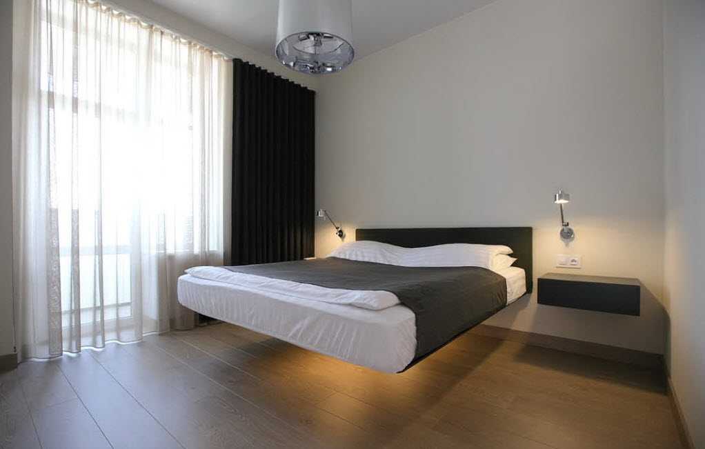 Напольное покрытие – ламинат или паркет, в ванной комнате – наливной пол с подогревом. Потолки – подвесные или натяжные со сложной системой светодиодной подсветки. Отделка стен – покраска, штукатурка или покрытие ламинатом, цветовая гамма – светлая. В ванной можно использовать плитку, при условии, что на ней нет рисунков и узоров.