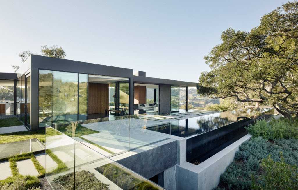 Окна в подобных жилых домах большие, при этом используются тонкие рамы, распространено и безрамное остекление. Нередко на фото дома Хай-тек представлены полностью застеклённые здания, что придаёт постройкам «воздушность» и увеличивает уровень освещённости.