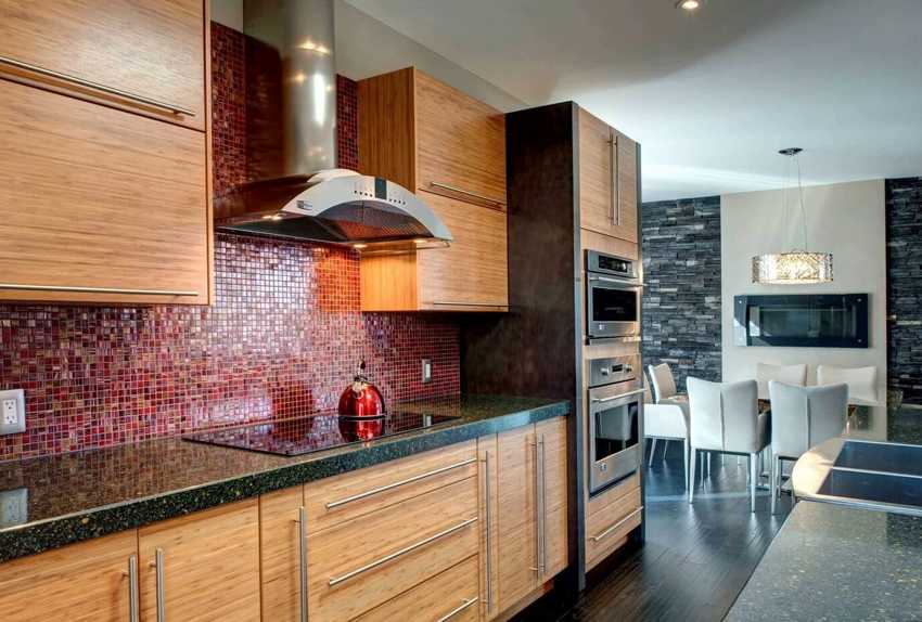 Аналогичное оформление фартука подойдет и для стиля модерн. Дизайнерское оформление в стилях этно и бохо предполагает яркие оттенки, пестроту и эклектику, которые должны присутствовать и на рабочей стене. Здесь будет уместен яркий узор из плитки-мозаики на кухне.