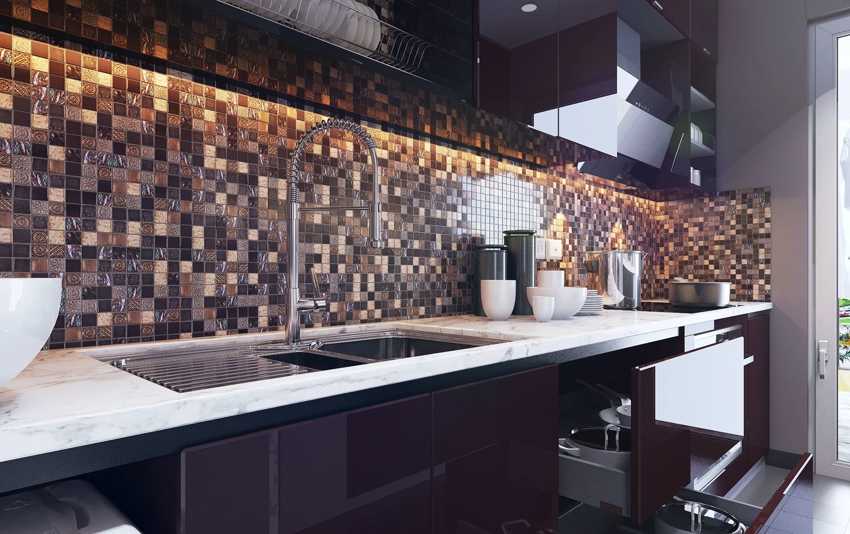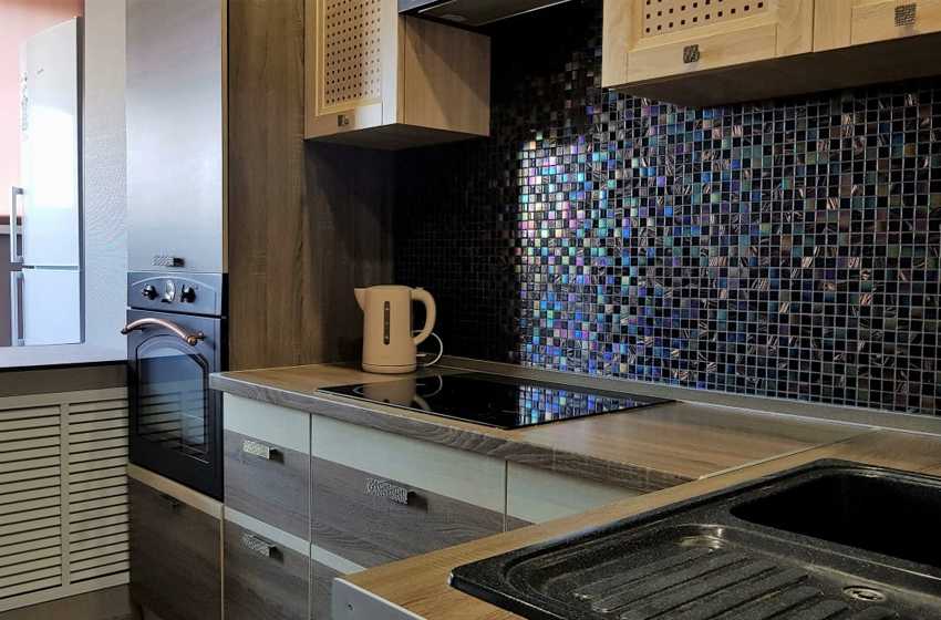 Необходимо принимать во внимание, что мелкая плитка ложиться на идеально идеальные поверхности стен, что тоже востребует лишних усилий и денежных затрат. Если вас не пугают эти трудности, рассмотрим, какие разновидности мозаики можно применять для отделки фартука в кухонной комнате
