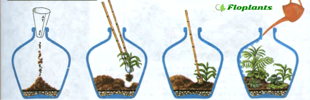 После создания рельефа можно приступать к засаживанию сада используя ложку и вилку. Для заполнения бутылки Вам понадобится около 6 растений. Из них должно быть, как минимум одно древовидное и одно стелющееся. После посадки растения вокруг него необходимо обязательно уплотнять землю.