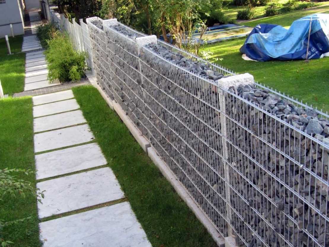 Эти легкие стены забора из габионов строятся очень быстро. Они легко доступны, так как готовые заборные панели и постаменты можно купить на складе здания. Они довольно узкие (15-20 см), поэтому подходят, прежде всего, для строительства жалюзи, заборов, сараев и беседок.