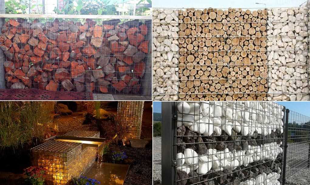 Укладку наполнителя необходимо осуществлять упорядочено, чтобы габион имел привлекательный вид. Для этого при укладке подбираются камни с ровной гранью. Они располагаются этой гранью к решетке, чтобы стенка выглядела монолитной. Внутри габион можно заполнить любым образом. В качестве наполнителя может использоваться не только щебень, но и морская галька. Неплохо смотрится натуральный камень «дикарь» и даже деревянные поленья, которые укладываются определенным образом. Более дорогим удовольствием будет использование облицовочного кирпича, который может быть уложен по диагонали.