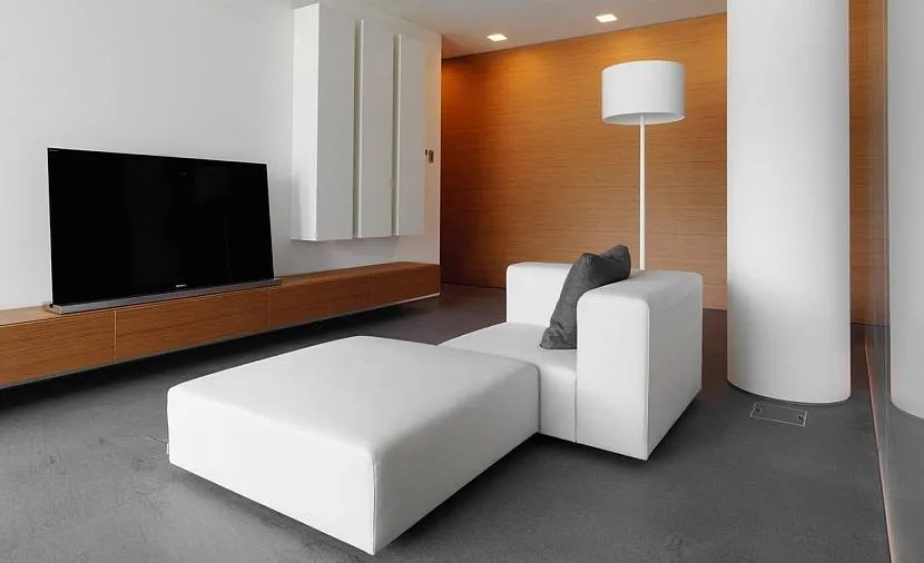 Центральное место отводится мягкой мебели с однотонной обивкой из кожи, льна или хлопка. Основные оттенки: белый, кремовый, серый или черный. Это невысокий диван прямоугольной формы — прямой или угловой, который наиболее часто располагают напротив телевизора.