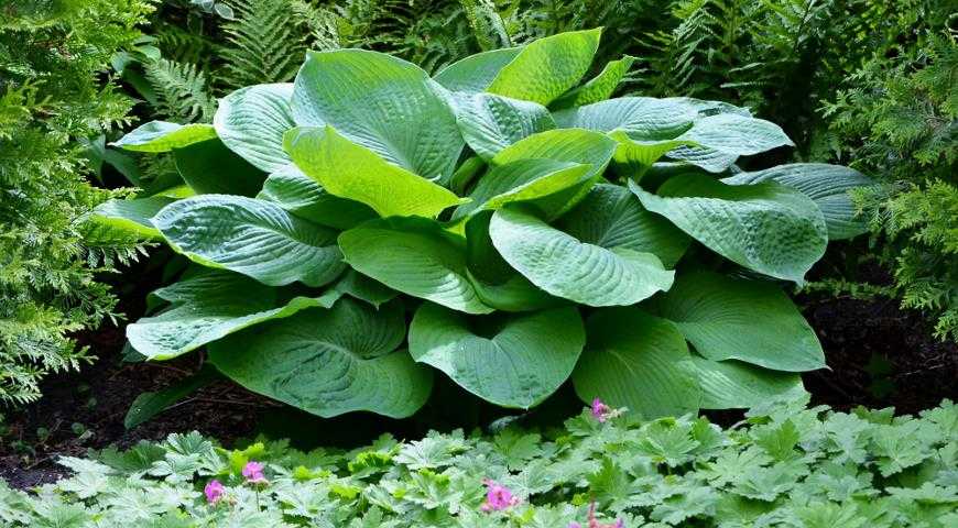 Голубые хосты, оттенок которых обусловлен особым восковым налетом на листьях, при ярком солнце теряют его и становятся зелеными.