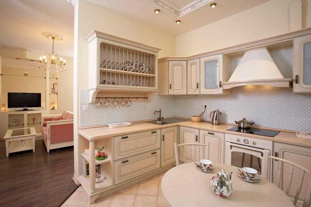 Такая кухня придется по душе практически всем. В данном стиле все сдержано, но не строго. Отлично впишется кухонный гарнитур из массива в светлом цвете с классической фурнитурой. Для освещения можно подобрать «хрустальную» люстру. Обеденная группа должна быть выполнена из тех же материалов, что и кухонных гарнитур. В качестве декора можно использовать вазу с цветами, фарфоровую посуду в серванте или шторы из легких материалов.