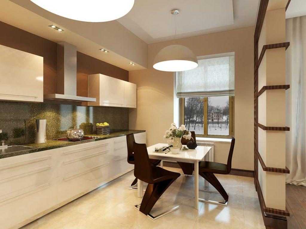 Шоколадно-бежевый глянец на покрытиях фасада, фартуке или облицовке стен придаст особое очарование стильному помещению. Коричневыми можно сделать контуры фасада и торцы мебели. Для маленького помещения выбирают стулья прозрачные или светло-бежевых тонов.