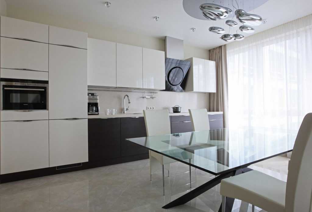 Такая кухня должна быть максимально удобной. Для кухонного гарнитура можно использовать глянцевые поверхности. Разбавить такой интерьер вам помогут декоративные элементы, например, необычные растения в горшках или яркие стулья